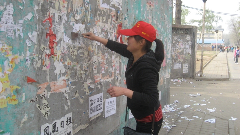 志愿者用水桶、刷子、铲子等工具,对学校中院甬道两旁的商业小广告进行了集中清理。在清理过程中,同学们不怕脏和累,凭着自己的耐心和坚持,小心翼翼的把广告残留物清理,将宿舍、食堂、教学楼墙壁上及张贴栏旁边的“牛皮癣”刮干洗净。经过一番辛苦劳动,校容校貌得到了有效改善。